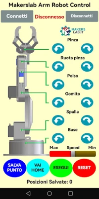 Med "Makerslab Arm Robot Control" får du tilgang til et komplett spekter av kommandoer for å mestre enhver oppgave. Fra nøyaktig åpning og lukking av griperen, til detaljerte rotasjoner av håndleddet, albuen, skulderen og basen, gir appen deg fullstendig fingerferdighet. Juster hastigheten i sanntid for finjusterte operasjoner, lagre spesifikke punkter for gjentakende oppgaver, og utfør forhåndsdefinerte sekvenser med et enkelt trykk. For fullstendige monterings- og programmeringsveiledninger, anbefaler Makerslab å besøke prosjektområdet på makerslab.it/progetti/.